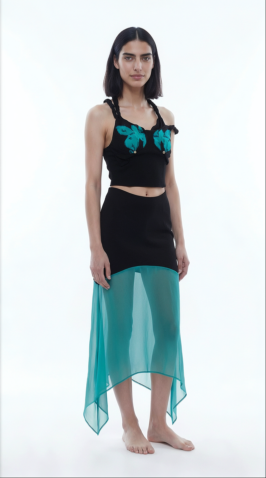 ALVISA, jupe mi-longue noire et turquoise