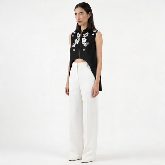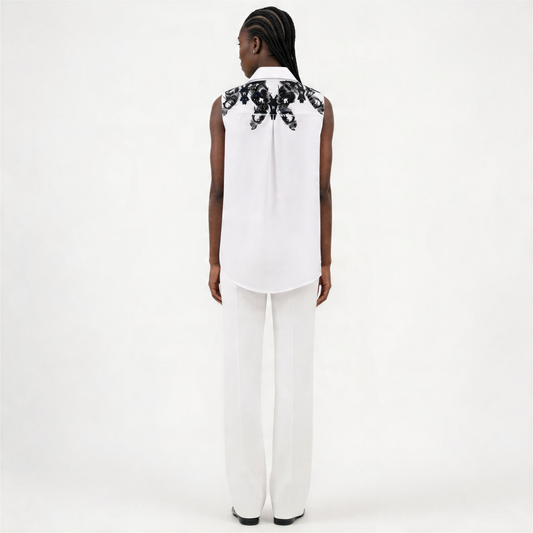 ARTEMISSE, chemise noire sans manches brodée et imprimée