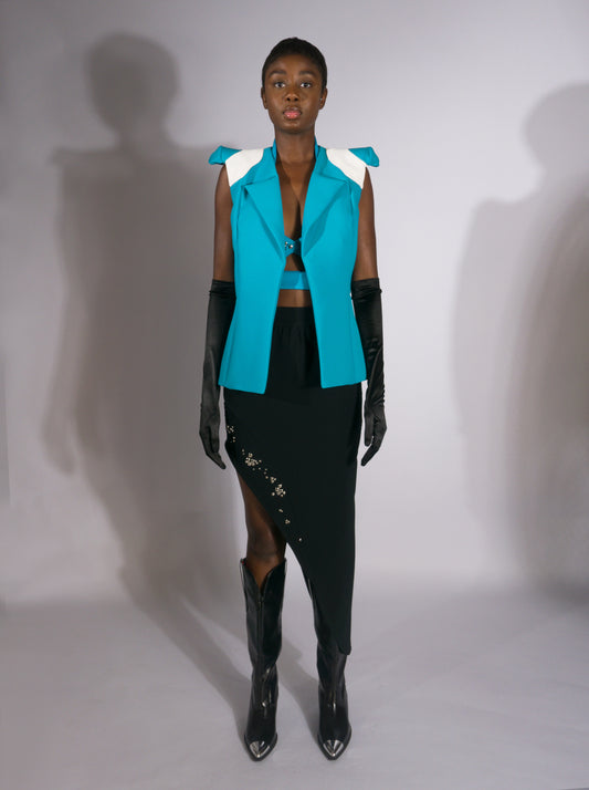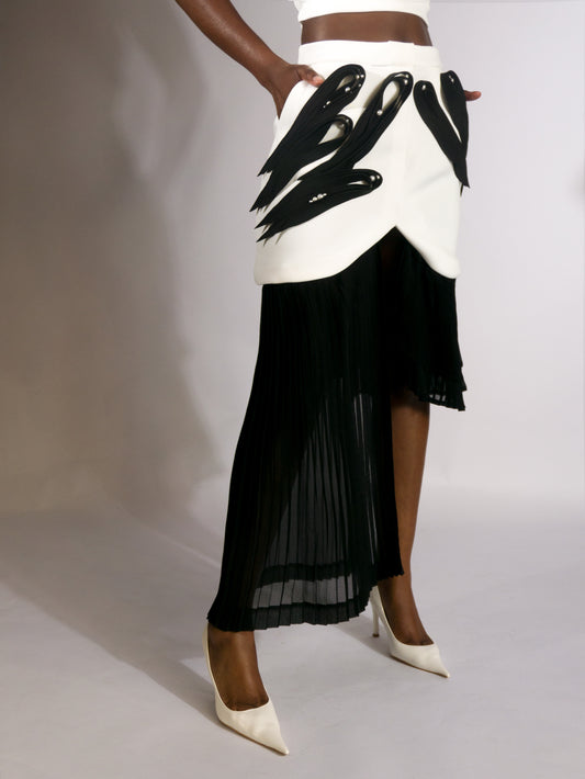 ARGO, jupe plissée asymétrique avec application de quilling en néoprène