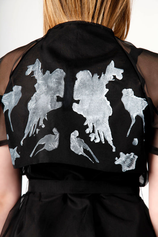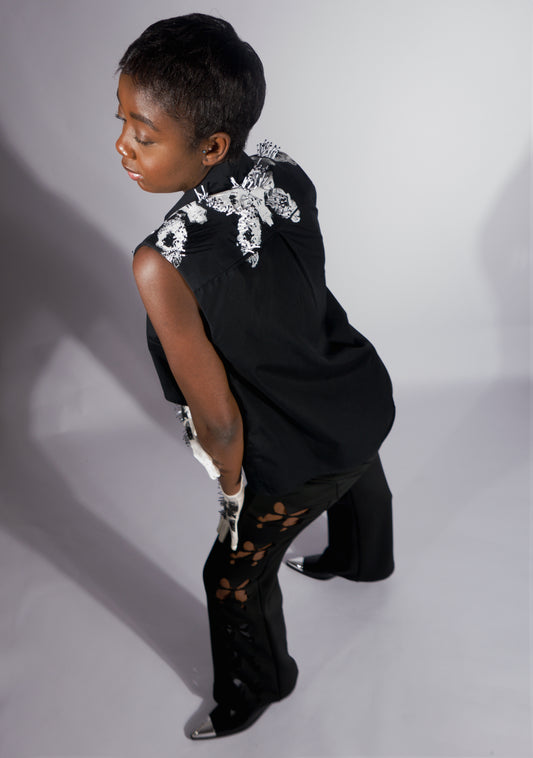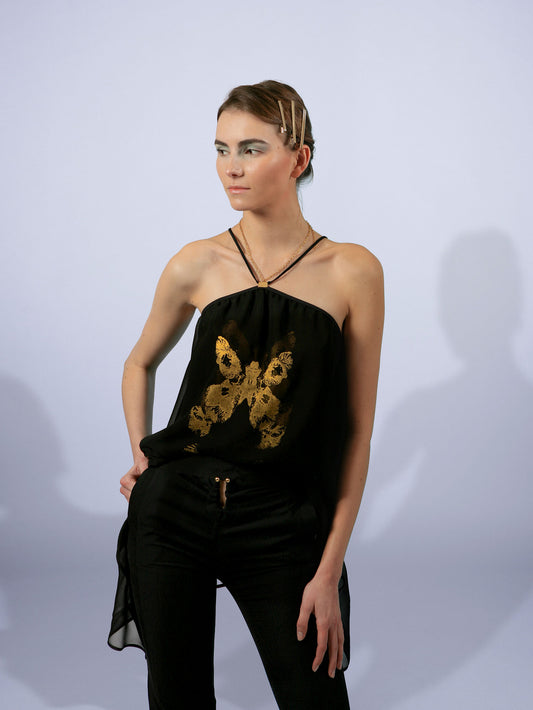 ARTEMISSE, chemise noire sans manches brodée et imprimée